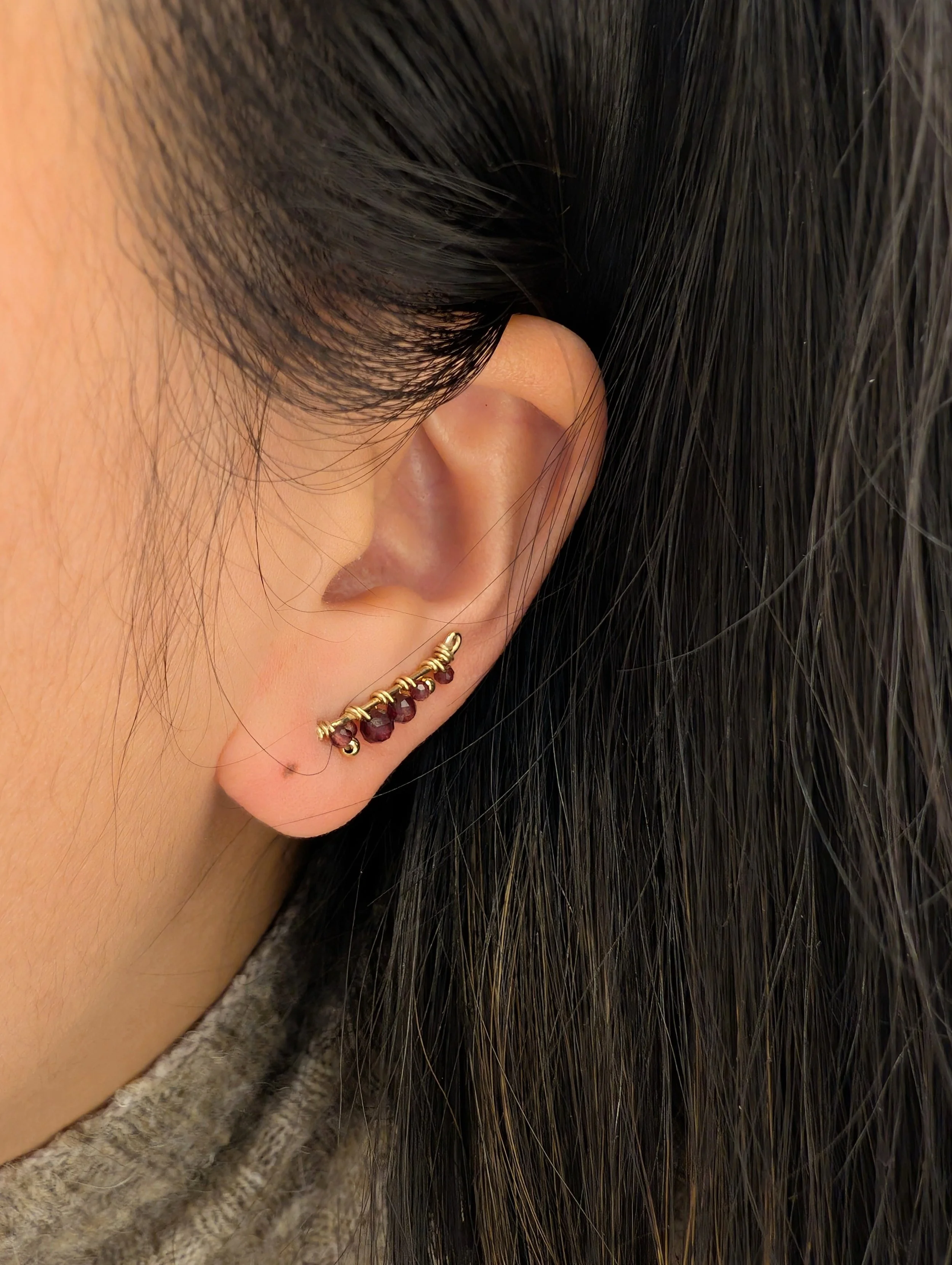 Boucles d’oreilles montantes en grenat aux tailles variées, discrètes et originales pour un porté quotidien.
