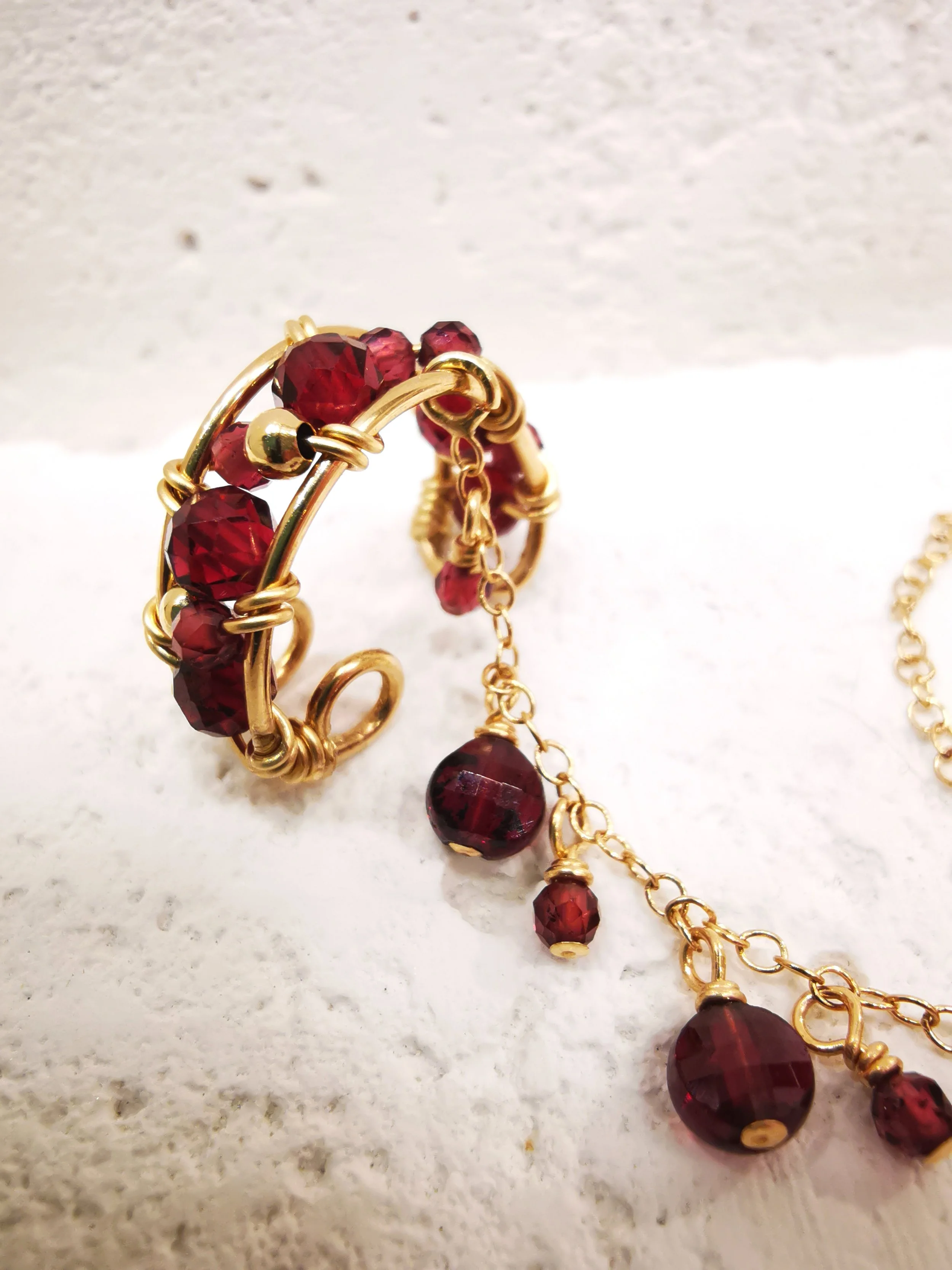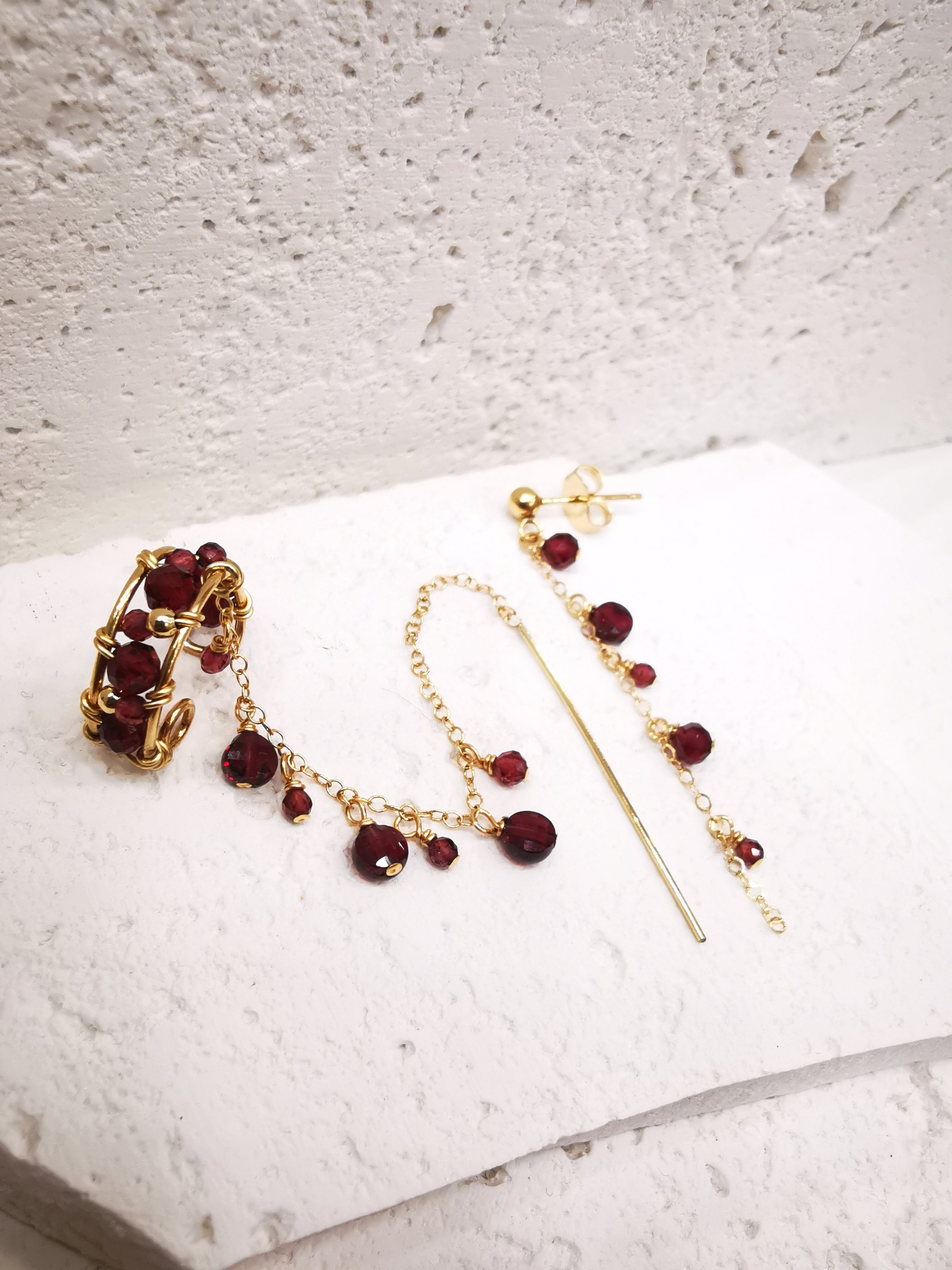 Bijou d’oreille en grenat aux tailles variées, aux reflets profonds, sublimé par une fine monture dorée et une chaîne délicate en mouvement.