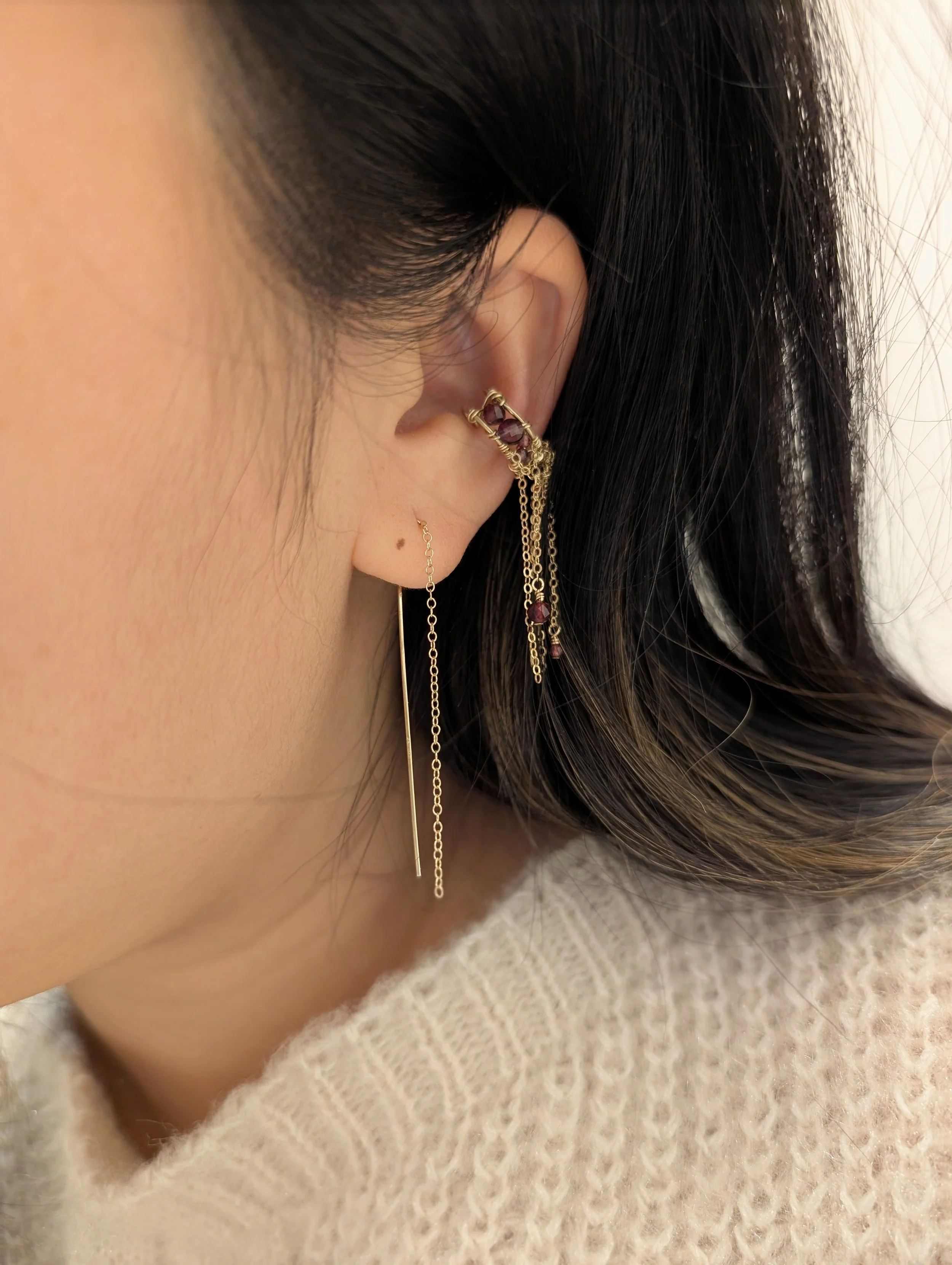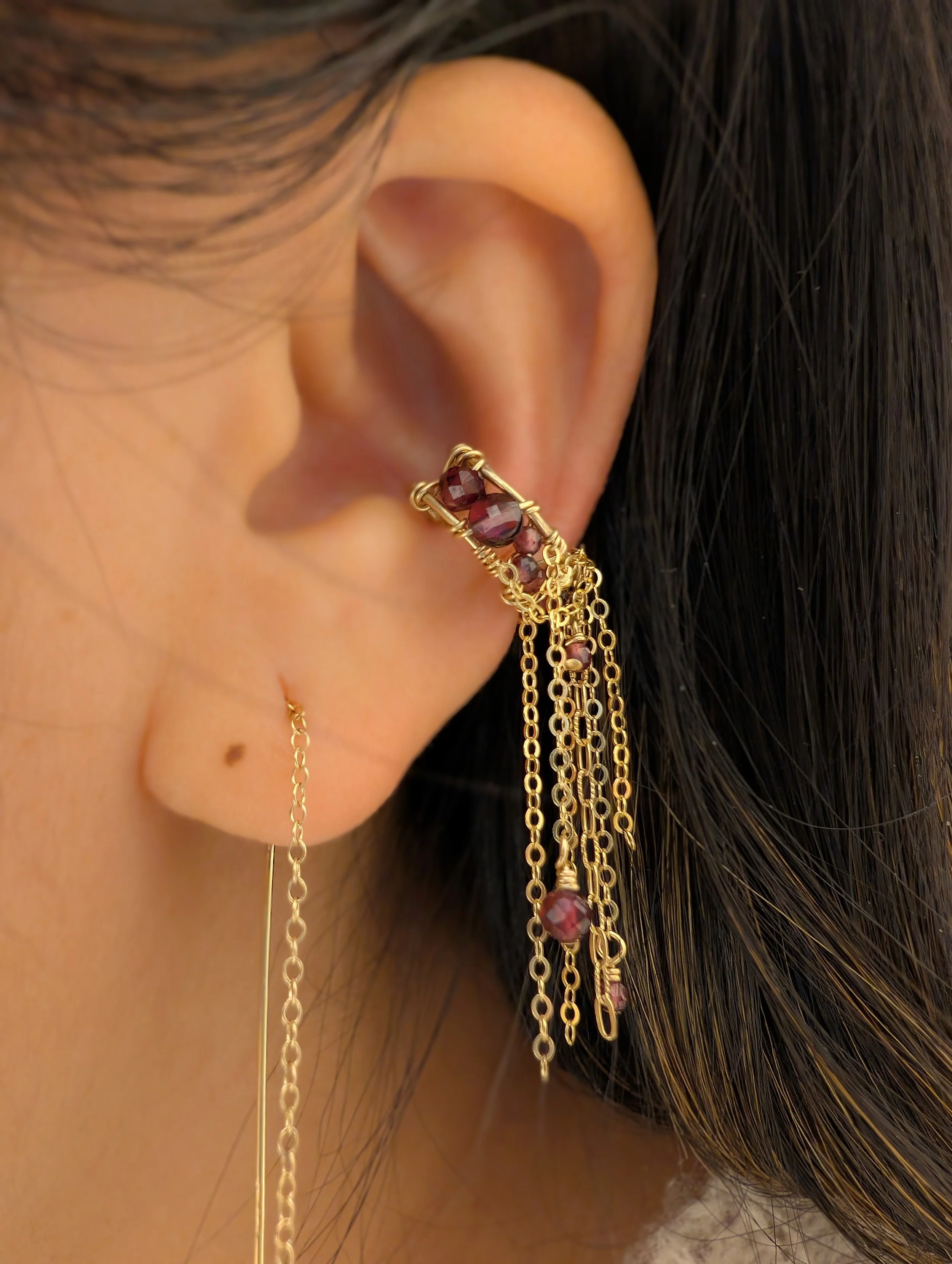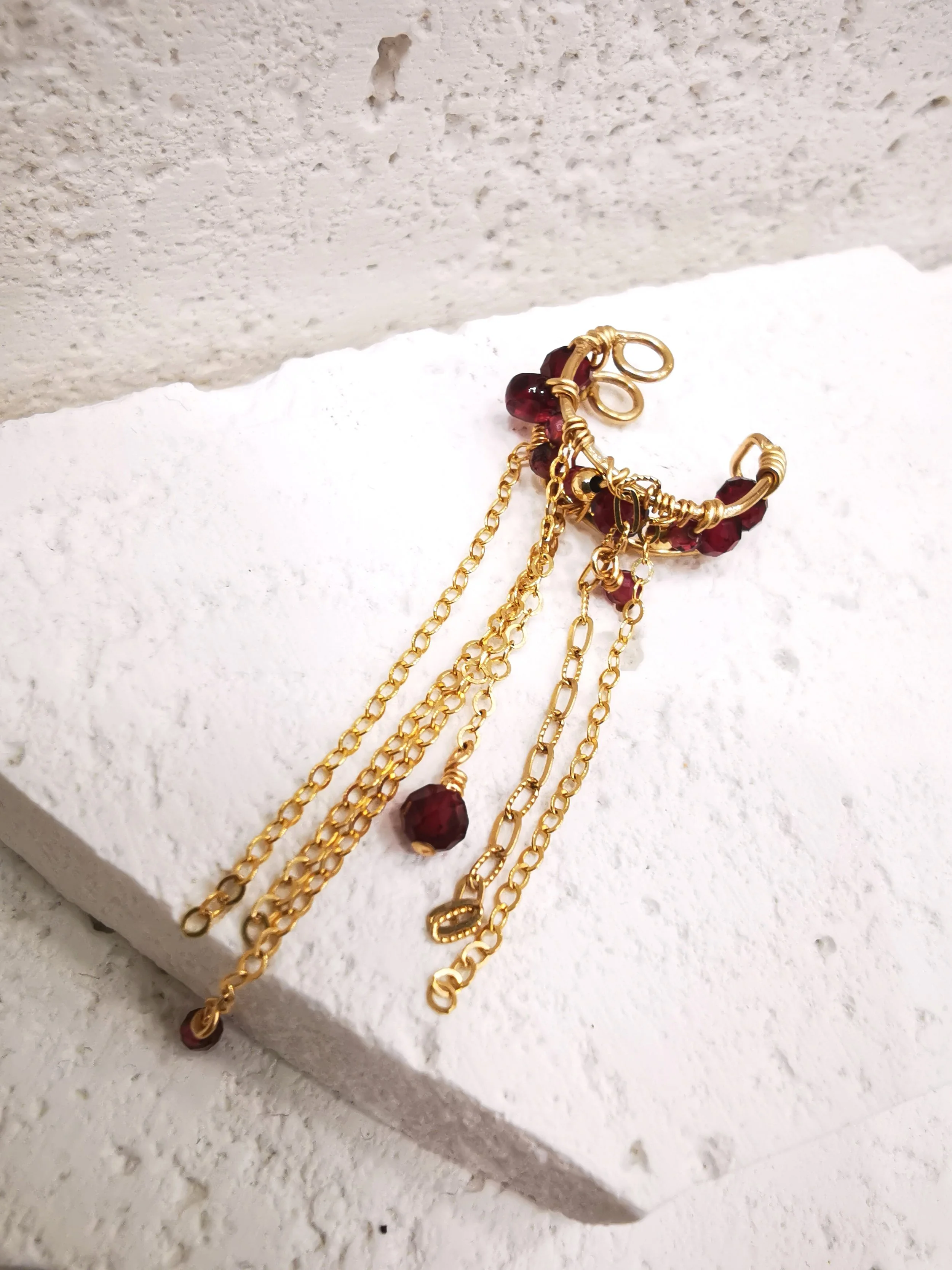 Bague d’oreille à chaîne, sans perçage, ornée de fines chaînes dorées et de pierres grenat aux différentes tailles. un bijou original et délicat, qui habille l’oreille avec légèreté et élégance.