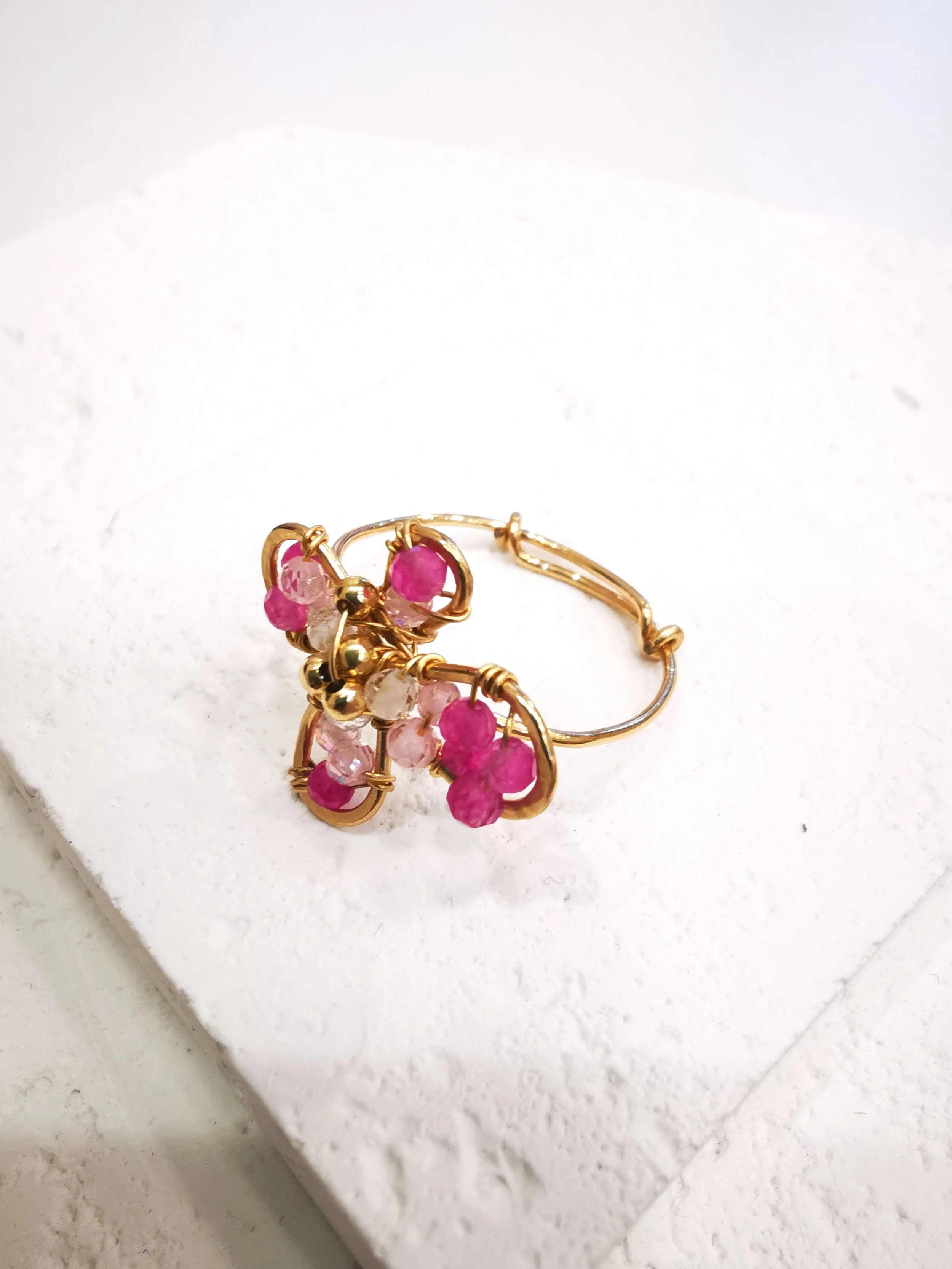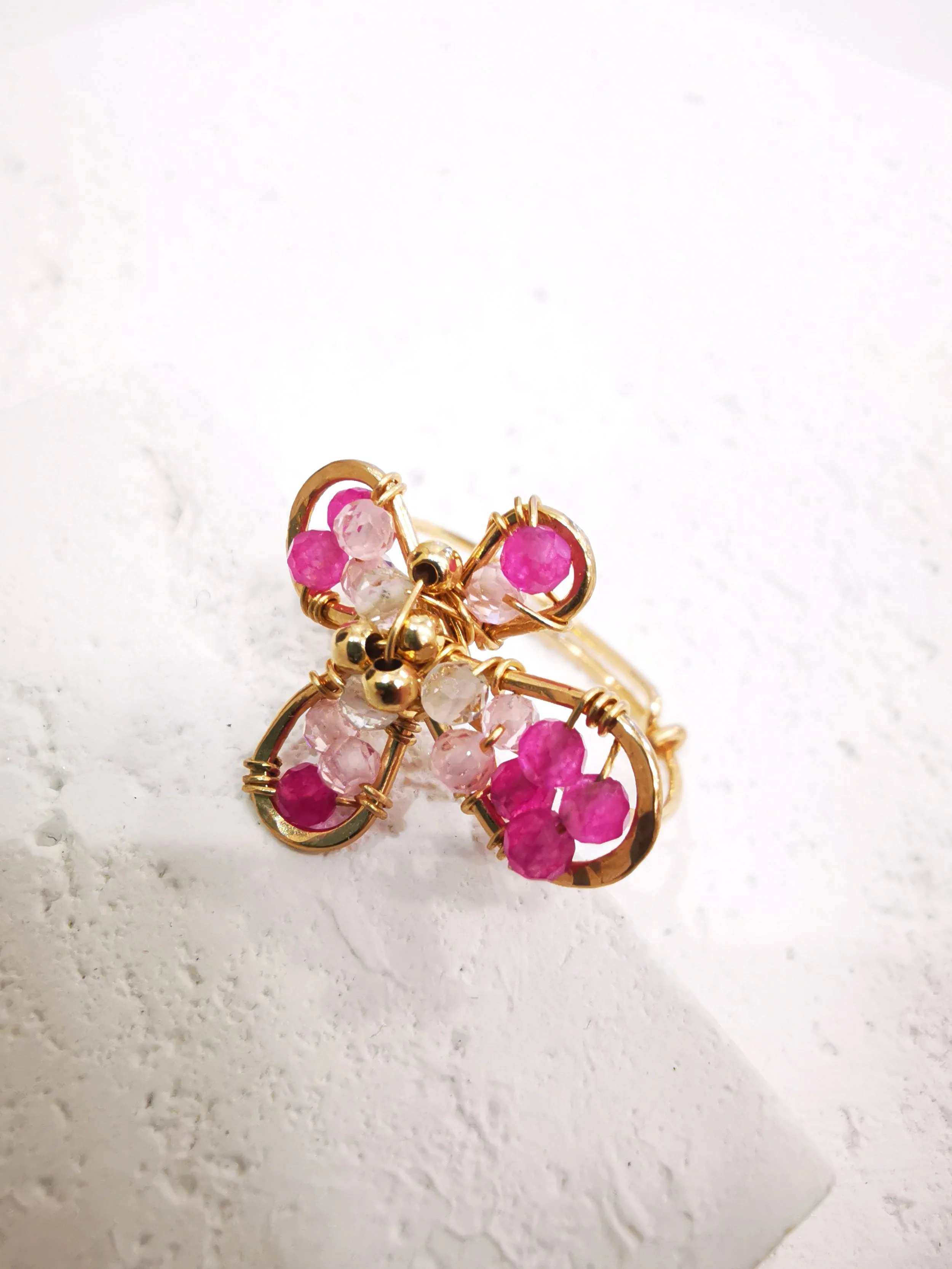 Une bague délicate en forme de fleur, Les petites perles sont délicatement montées à la main sur un fil doré, créant une fleur fine et lumineuse.