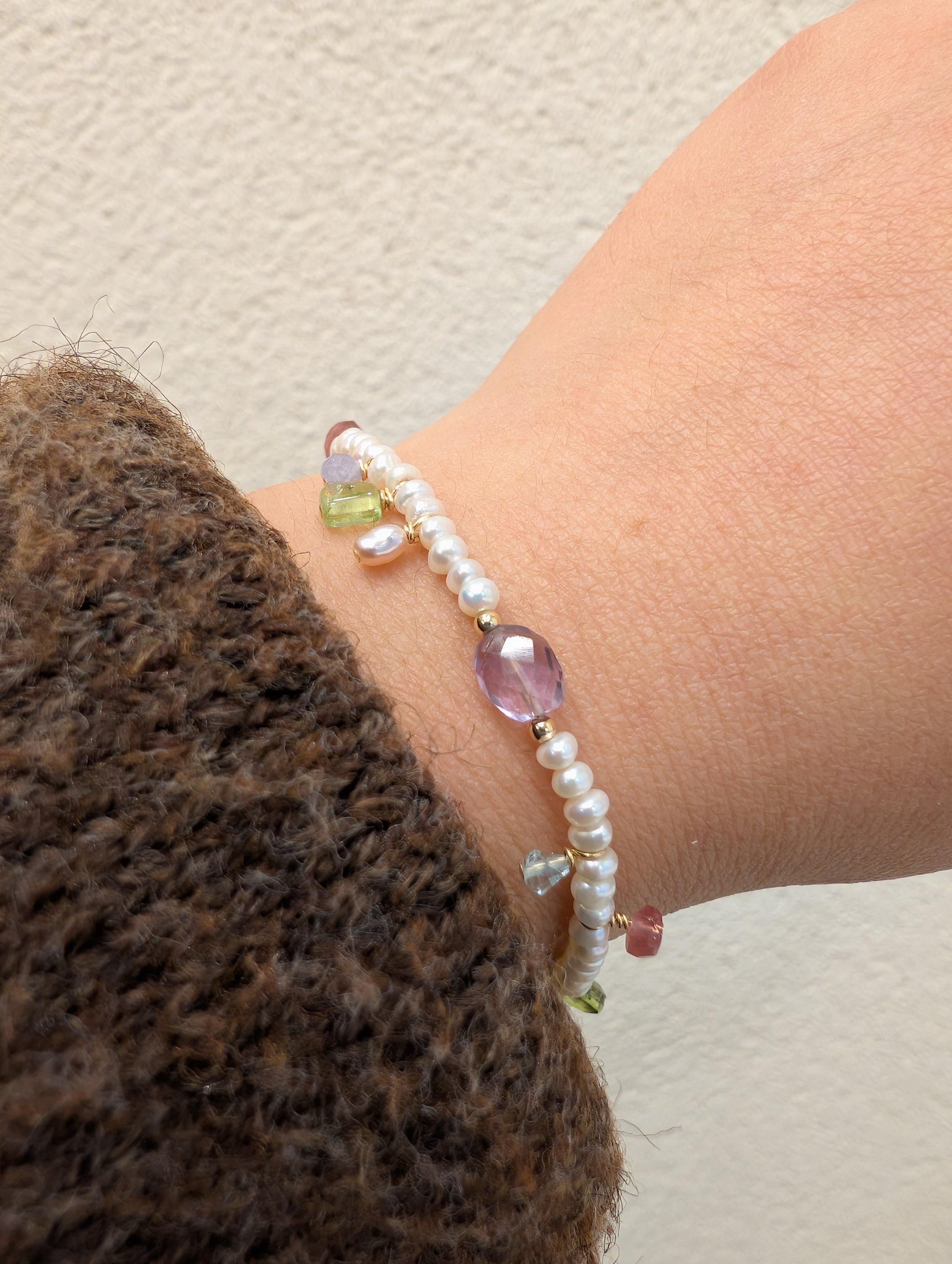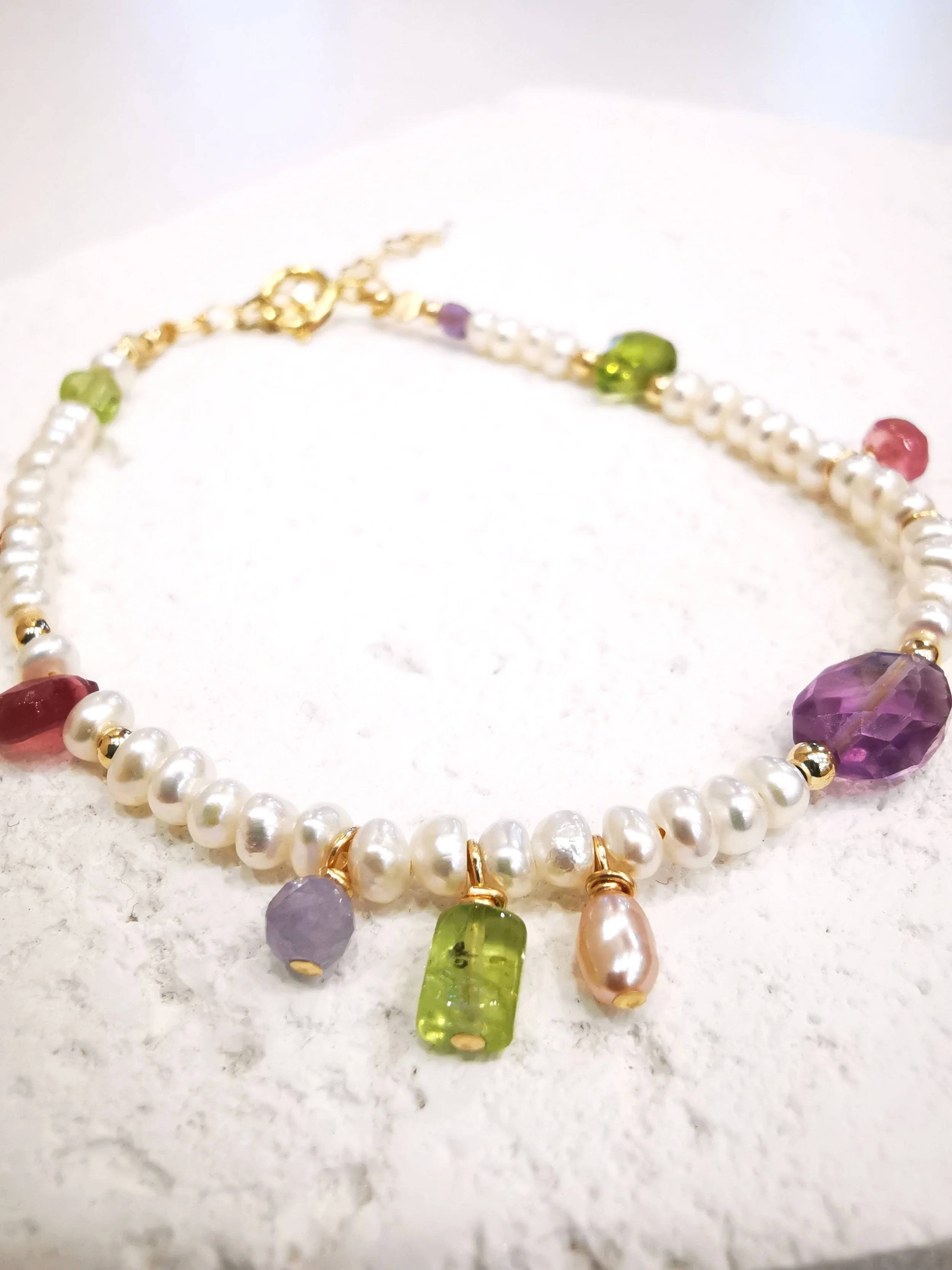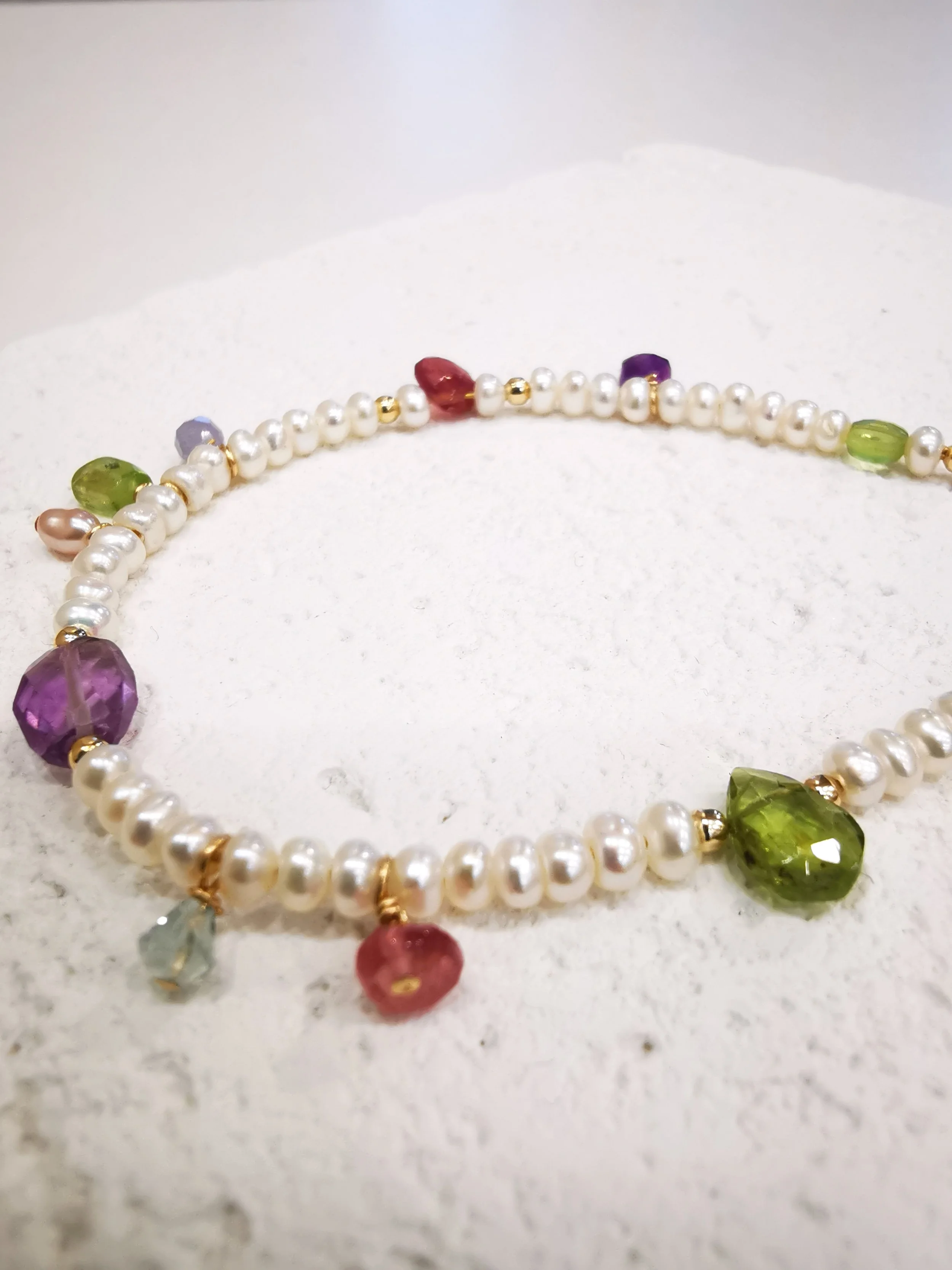 Perle d’eau douce, Péridot, Améthyste, Tourmaline, Aigue-marine