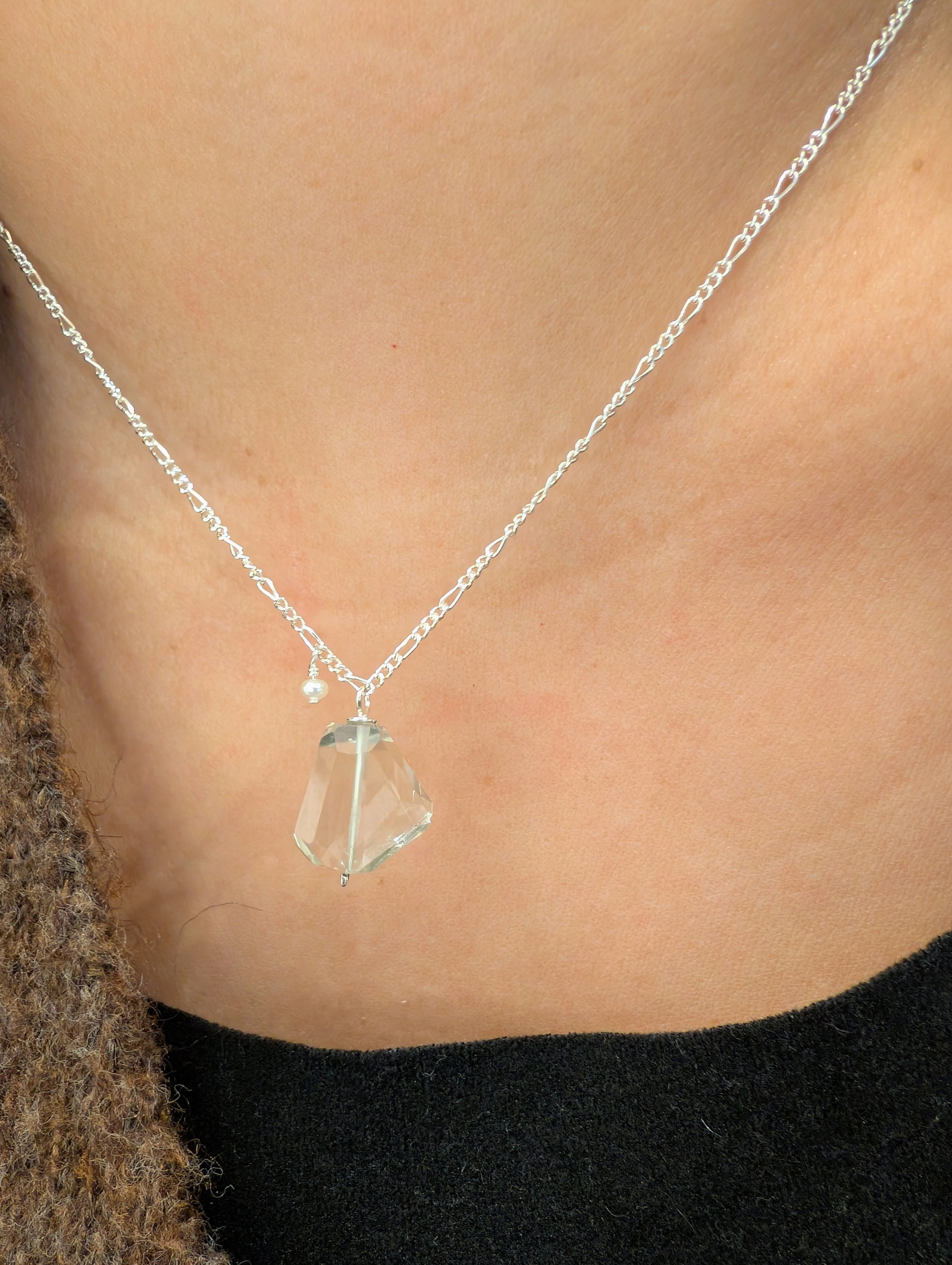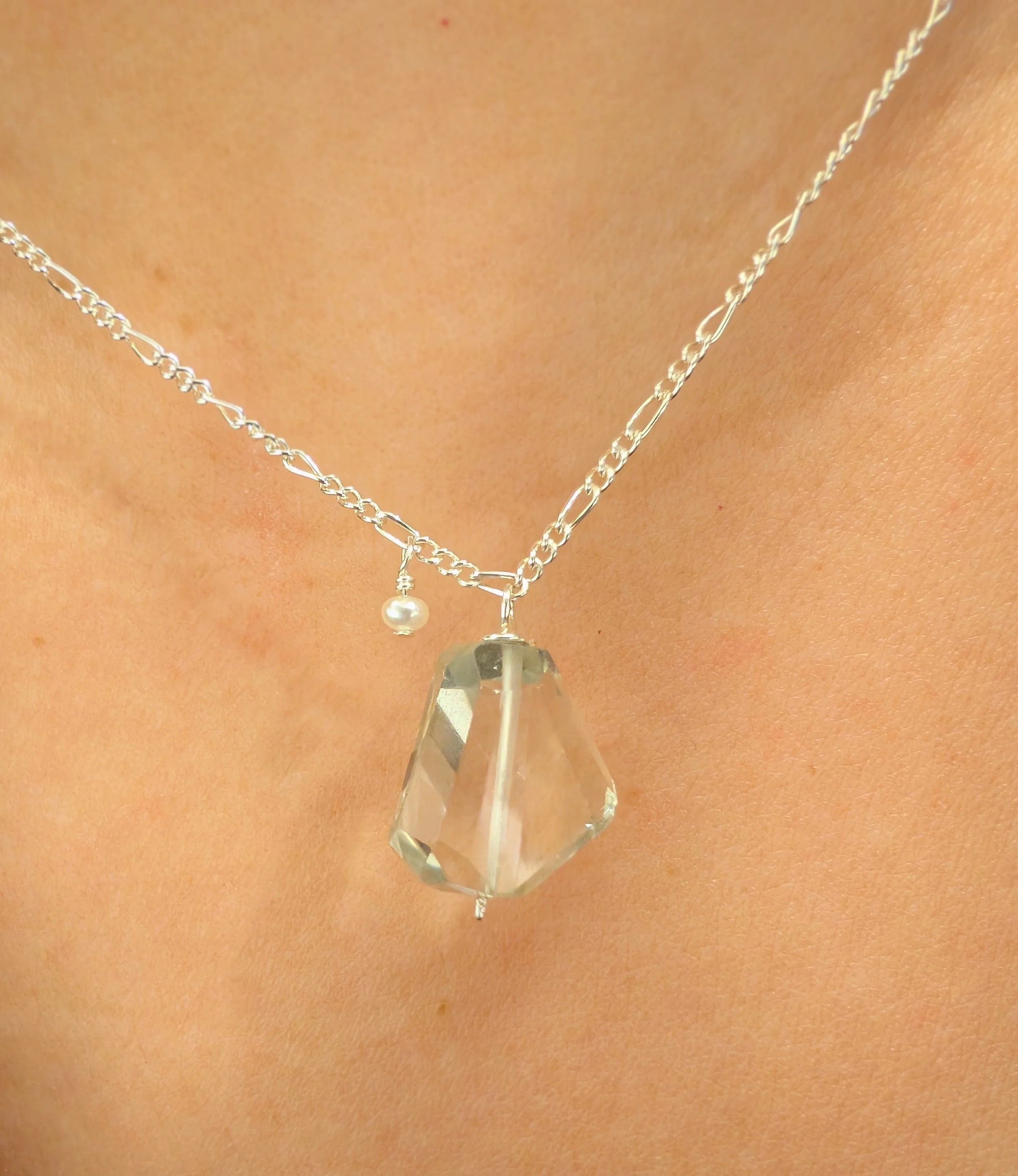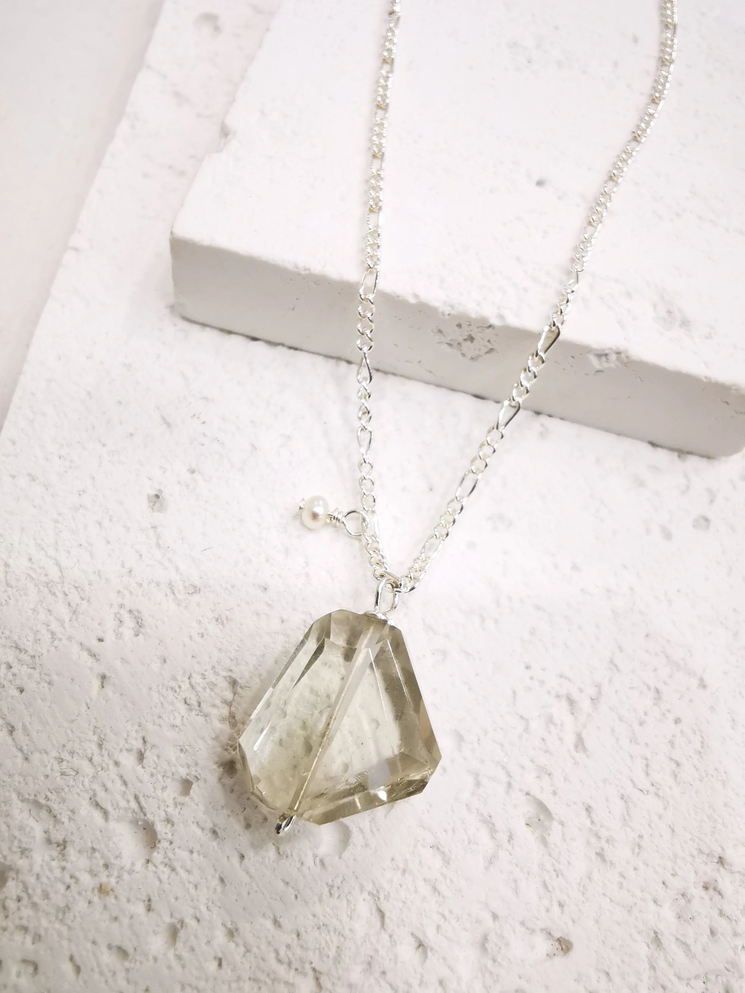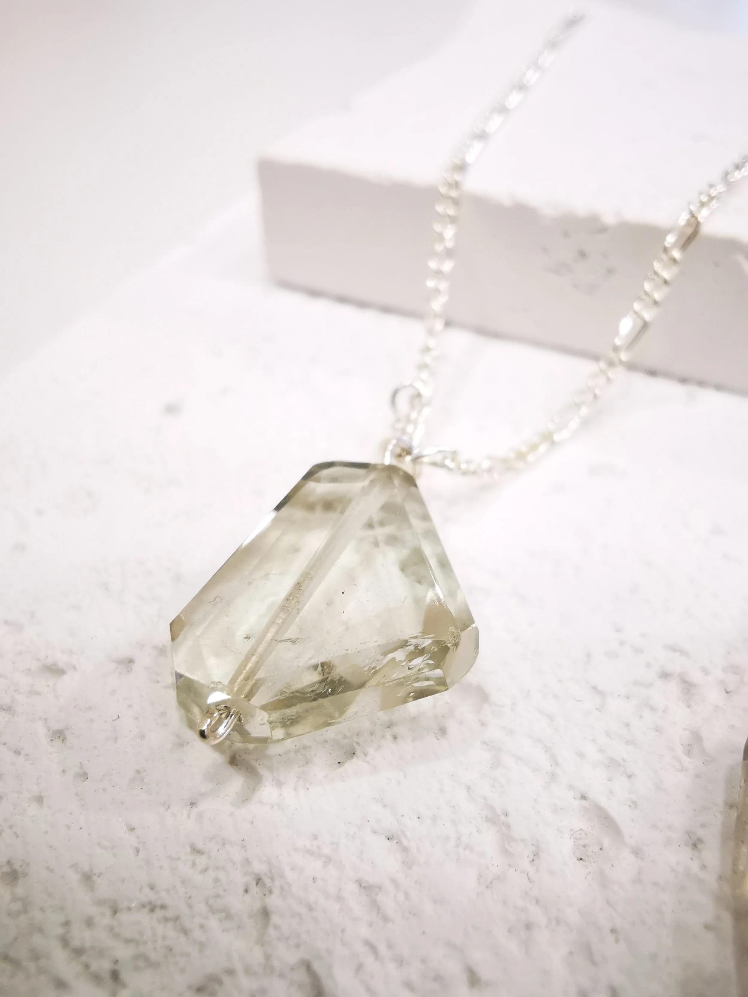 Un collier avec une pierre verte claire transparente, un bijou pour le quotidien. Intemporel et minimaliste.