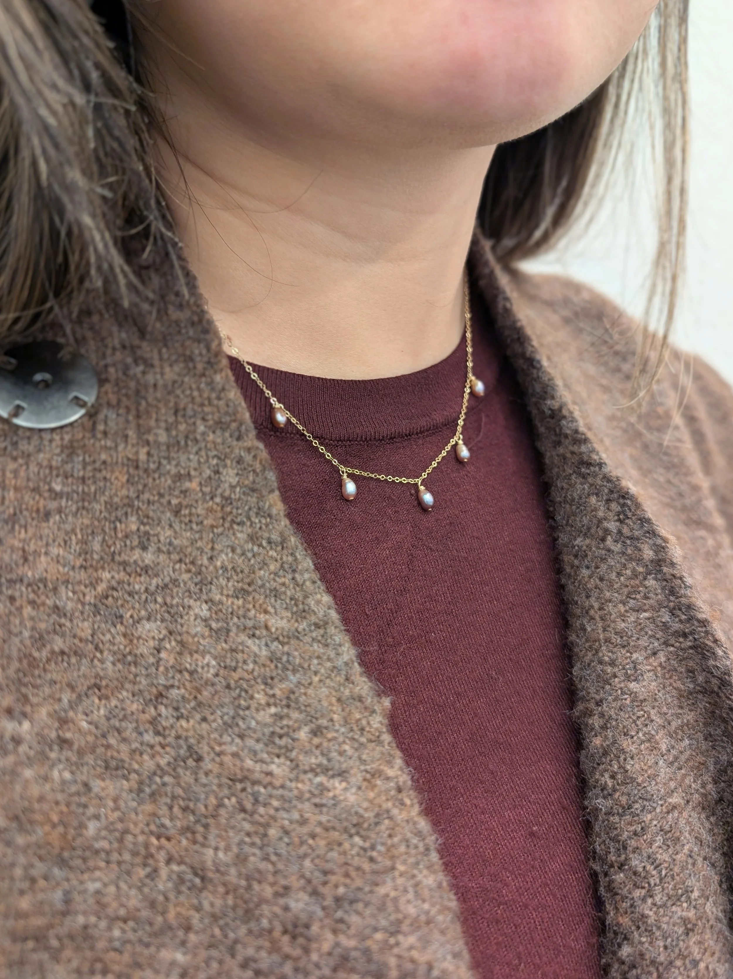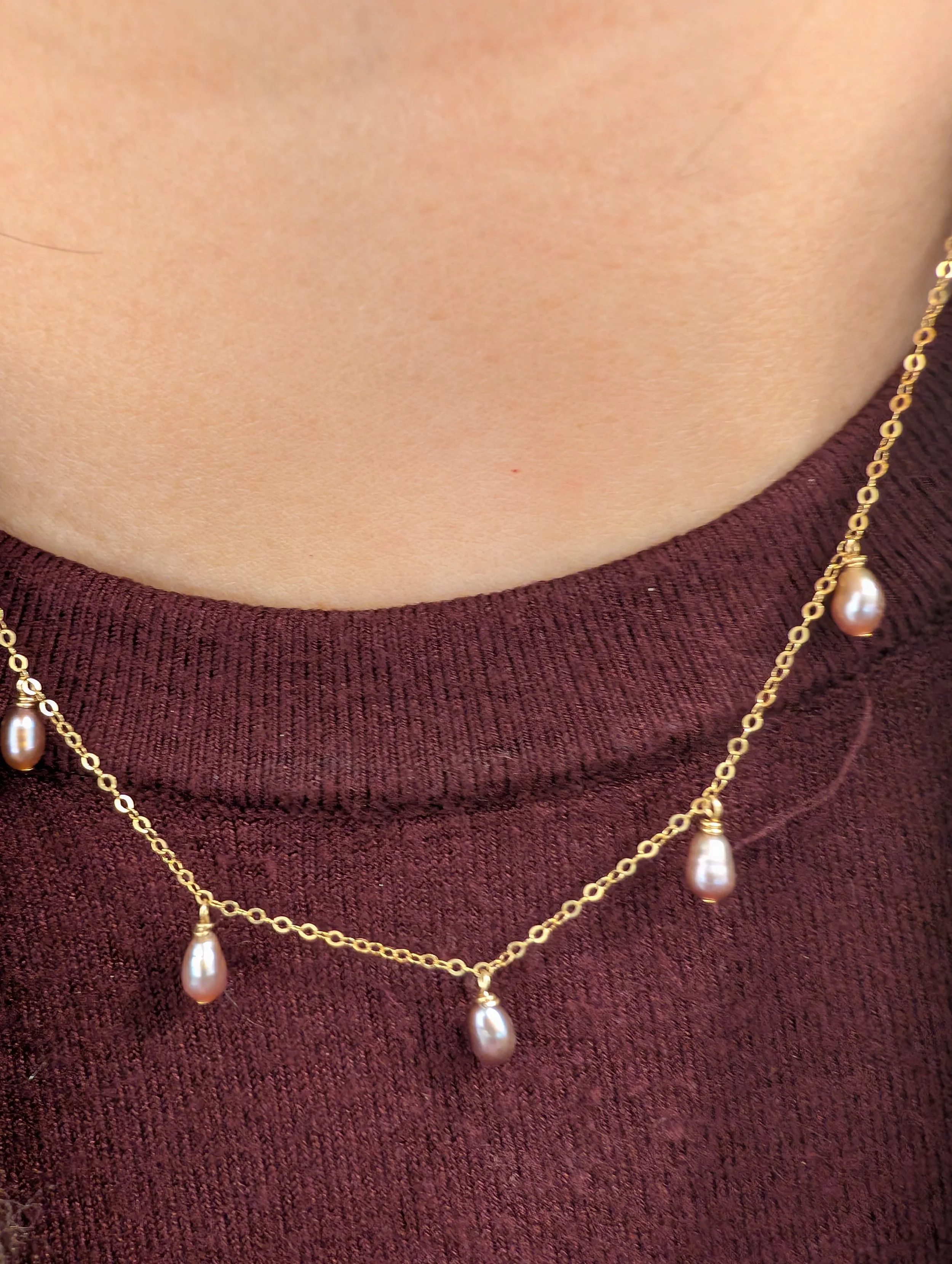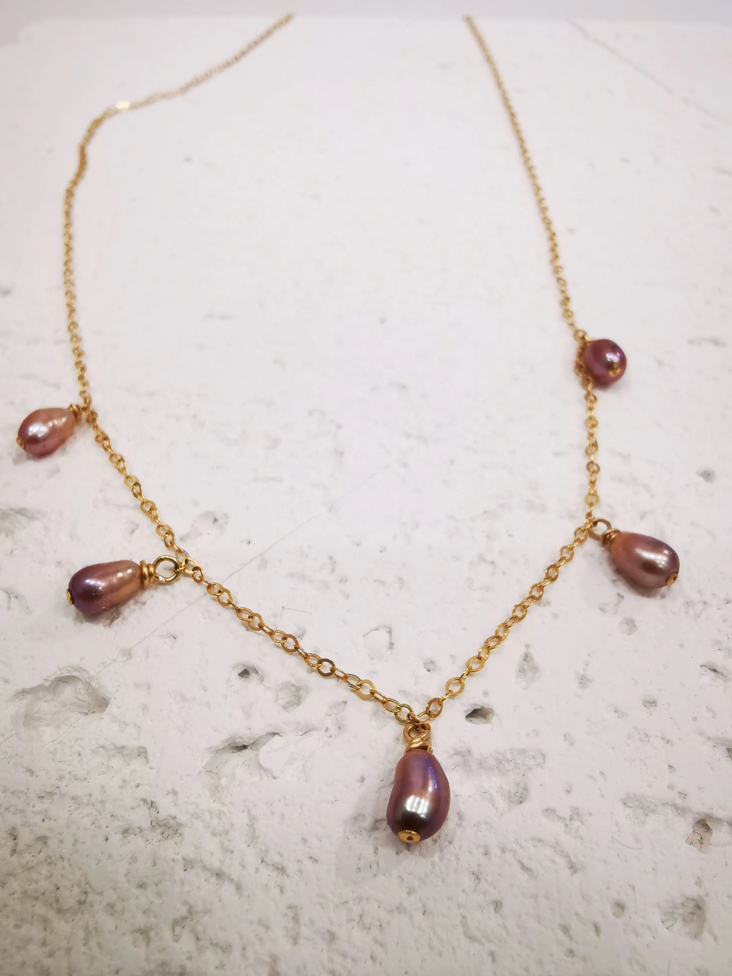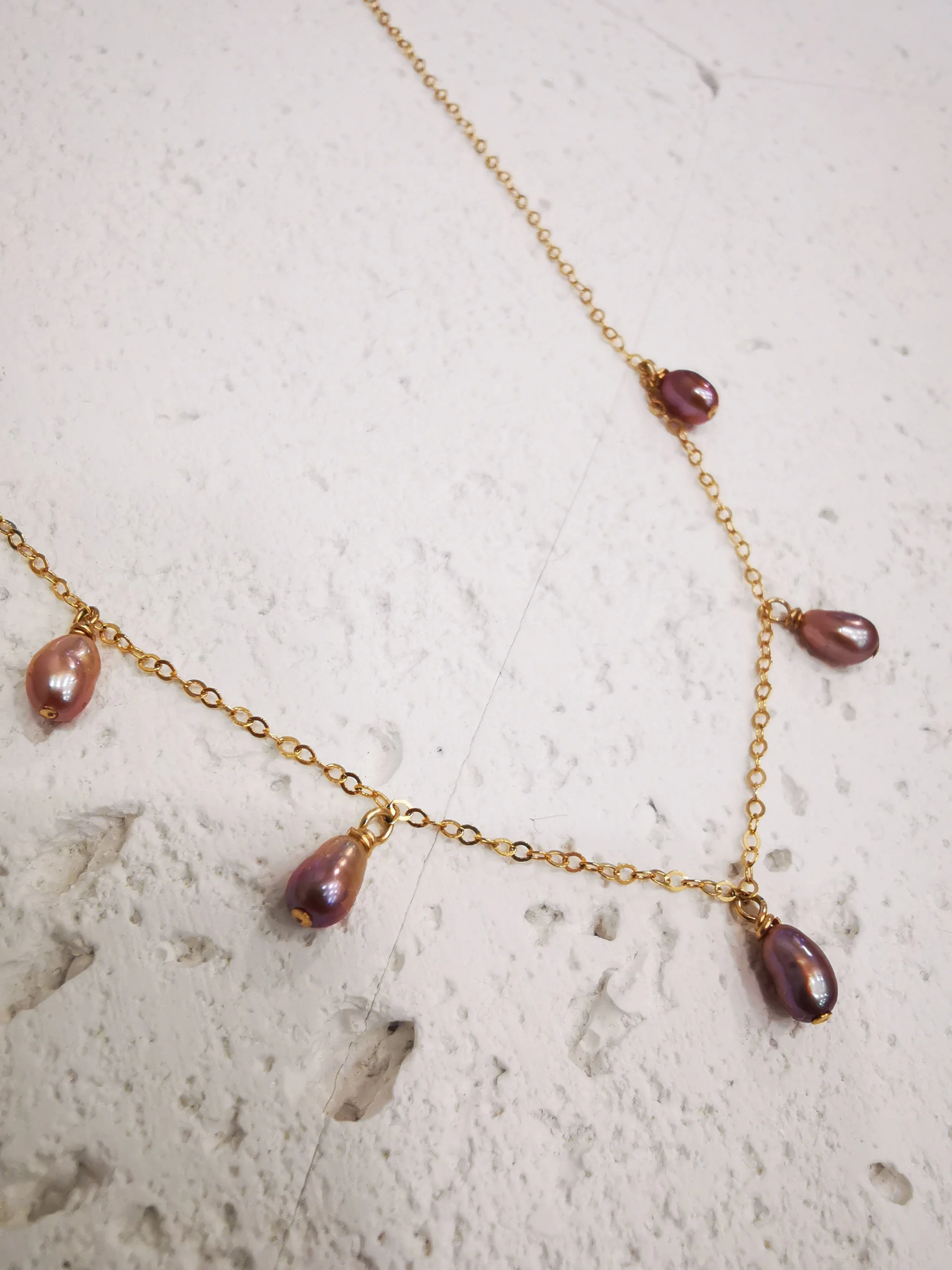 Un collier chaîne fine avec 5 perles rose violette, raffiné et intemporelle